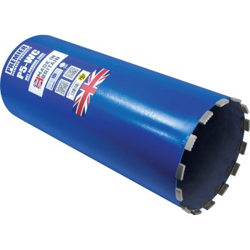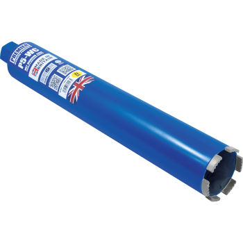 Premium wet diamond cores designed for drilling into concrete & reinforced concrete using suitable diamond drilling machines that run at appropriate speeds. The machine speed is mainly dependant on the core size and strength of the concrete. Ideally a drilling rig stand is recommended as this can be fixed down to ensure there is no movement in the set-up. However, for smaller diameters it is possible to use a hand-held diamond drilling machine. A constant flow of water of up to 4 litres per minute is advisable on most reinforced concrete applications, so direct mains water feed is recommended. The P5-WC wet cores can also be used to drill hard natural stones.