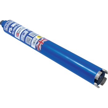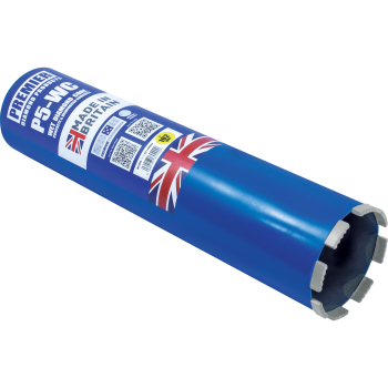 Premium wet diamond cores designed for drilling into concrete & reinforced concrete using suitable diamond drilling machines that run at appropriate speeds. The machine speed is mainly dependant on the core size and strength of the concrete. Ideally a drilling rig stand is recommended as this can be fixed down to ensure there is no movement in the set-up. However, for smaller diameters it is possible to use a hand-held diamond drilling machine. A constant flow of water of up to 4 litres per minute is advisable on most reinforced concrete applications, so direct mains water feed is recommended. The P5-WC wet cores can also be used to drill hard natural stones.