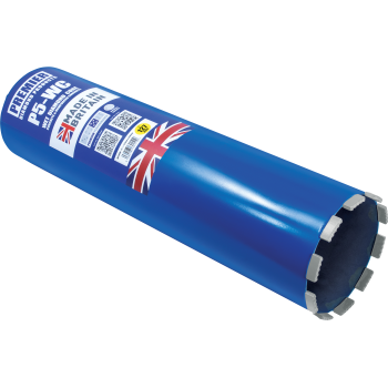 Premium wet diamond cores designed for drilling into concrete & reinforced concrete using suitable diamond drilling machines that run at appropriate speeds. The machine speed is mainly dependant on the core size and strength of the concrete. Ideally a drilling rig stand is recommended as this can be fixed down to ensure there is no movement in the set-up. However, for smaller diameters it is possible to use a hand-held diamond drilling machine. A constant flow of water of up to 4 litres per minute is advisable on most reinforced concrete applications, so direct mains water feed is recommended. The P5-WC wet cores can also be used to drill hard natural stones.