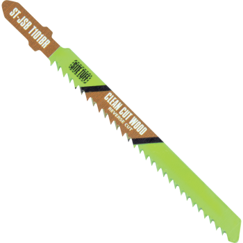Blades that cut on the up stroke will leave a feathered edge to the surface of the material, but are smoother and easier to use. Select a reverse cut/ down cut blade to ensure a clean finish to the cutting surface.